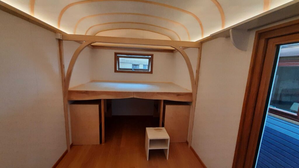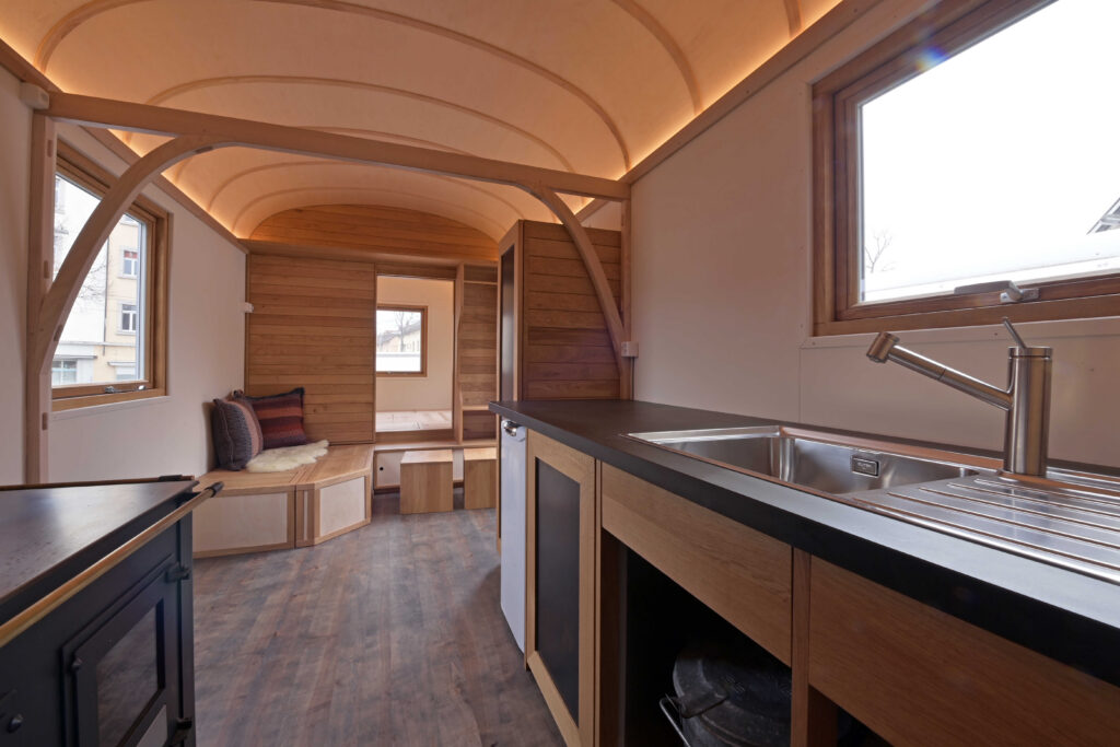 Je nach Bedarf bauen wir Küche, Bett, Tisch, Regale, Verschiedene Stauraum-möglichkeiten etc. ein.